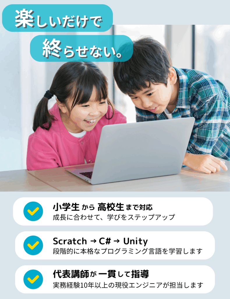 ビジュアルプログラミング言語(スクラッチ)から始まり、コードプログラミング(C#)の基本を習得後、本格的な開発ツール(Unity)でゲームをつくります。