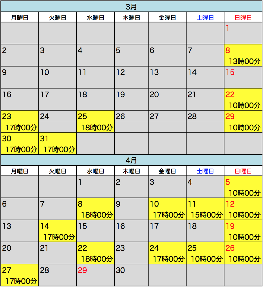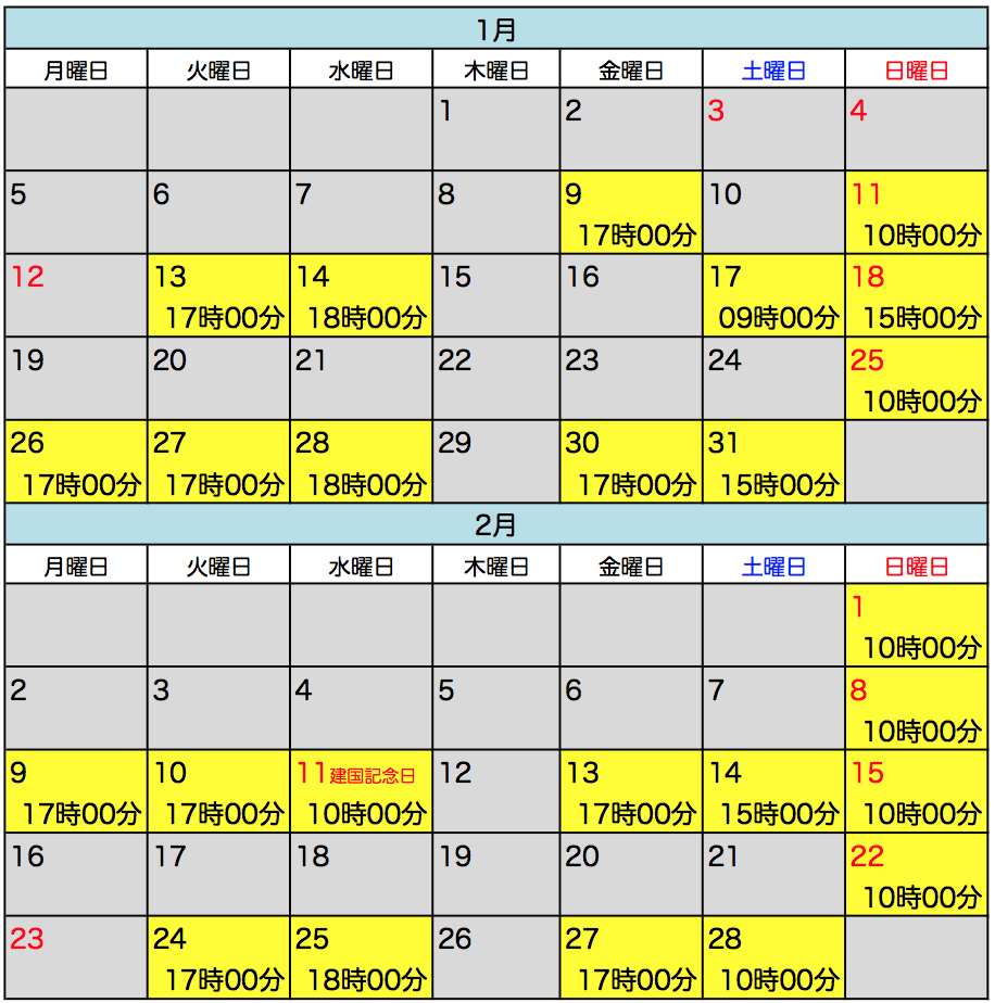 | 第1・3 土曜日 | 09時00分〜10時00分 | 60分 |